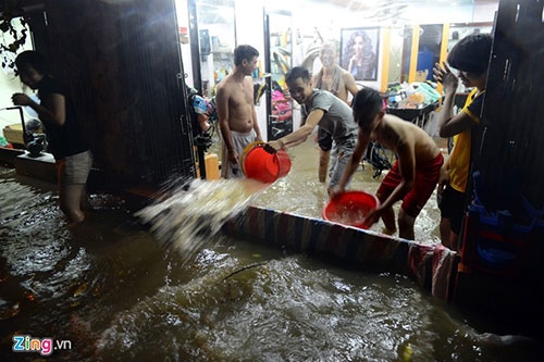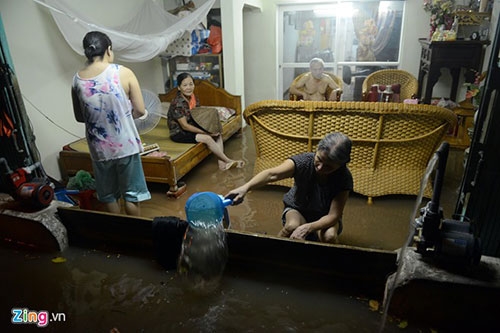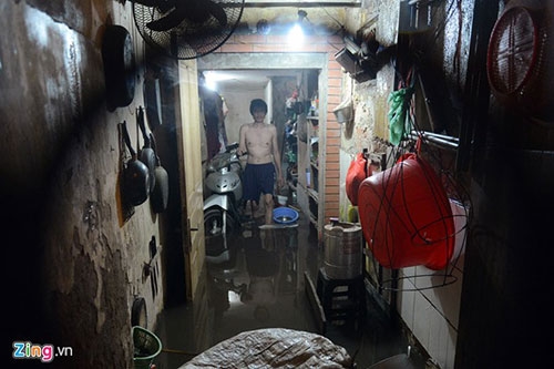 Tại nhà B4 tập thể Thành Công, quận Đống Đa, các hộ ở tầng 1 bị nước tràn vào nhà không kịp trở tay. Ảnh: Anh Tuấn. |