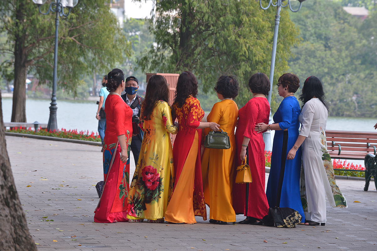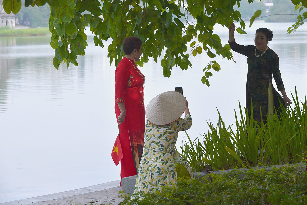 Khu vực hồ Gươm trong đầu sáng nay khá nhiều nhóm chị em đi chụp ảnh. Không chỉ có các thiếu nữ trẻ mà rất đông các bà, các cô U60, U70 cũng ra tranh thủ tạo dáng chụp ảnh sau một thời gian dài ở nhà chống dịch.