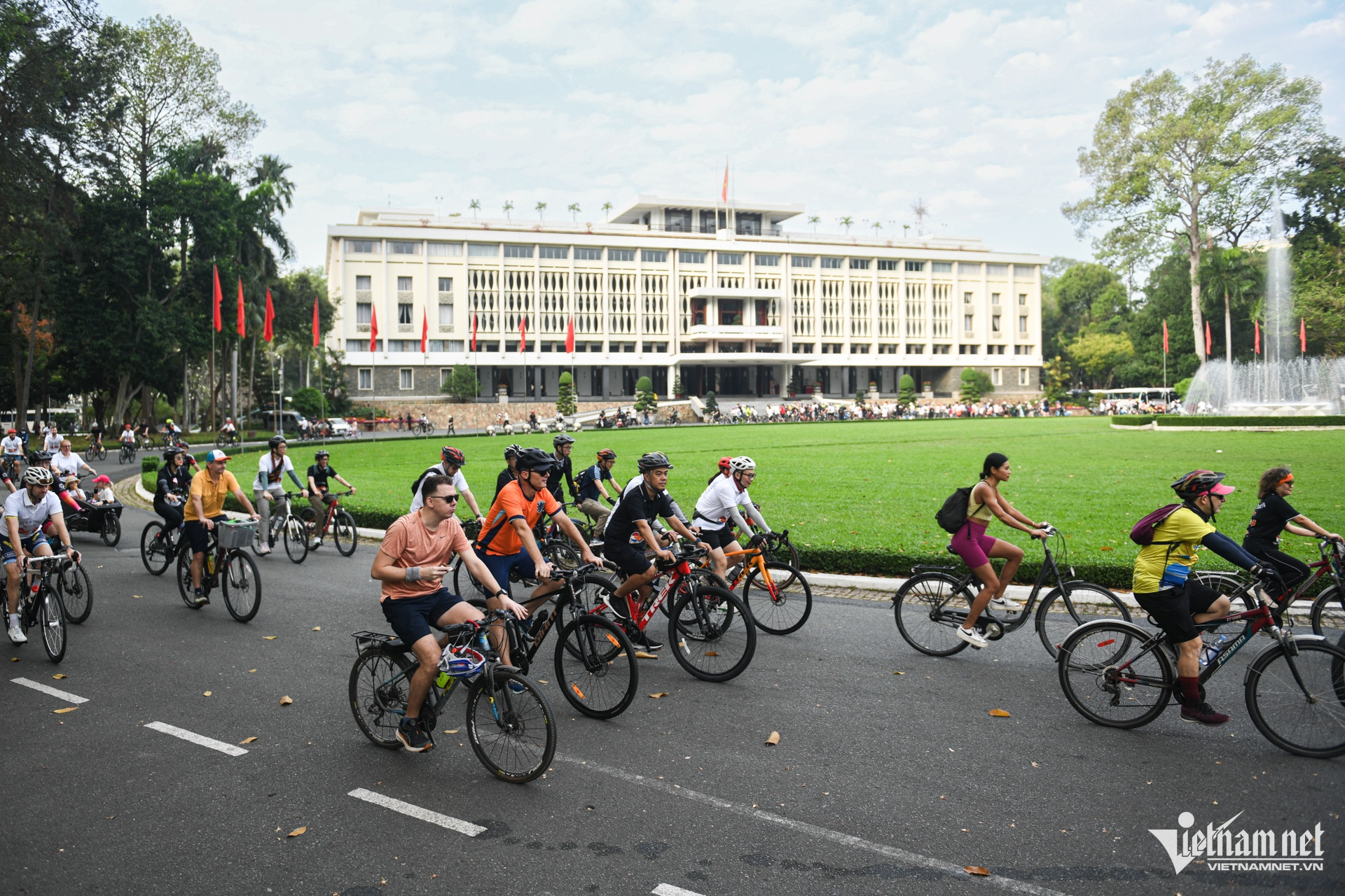 Gia đình anh Nguyễn Hoàng Anh (quận Bình Tân) chụp ảnh lưu niệm trong khuôn viên Dinh Độc Lập. "Gia đình tôi thường đạp xe vào cuối tuần để rèn luyện sức khoẻ. Thông qua hoạt động này, các cháu nhỏ sẽ thêm yêu bộ môn xe đạp; đồng thời khuyến khích cộng đồng sử dụng các phương tiện công cộng nhiều hơn", anh Hoàng Anh nói.