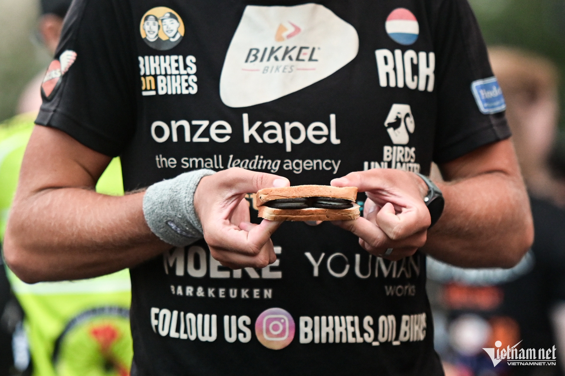 Trước khi bắt đầu chặng đường tại TPHCM, Rick Keijzer ăn nhanh chiếc bánh mì kẹp để nạp năng lượng. "Chúng tôi đam mê đạp xe và thích khám phá thế giới. Hành trình từ Hà Lan đến Việt Nam là trải nghiệm tuyệt vời. Tôi thấy việc di chuyển thường xuyên bằng xe đạp hoàn toàn khả thi tại TPHCM".