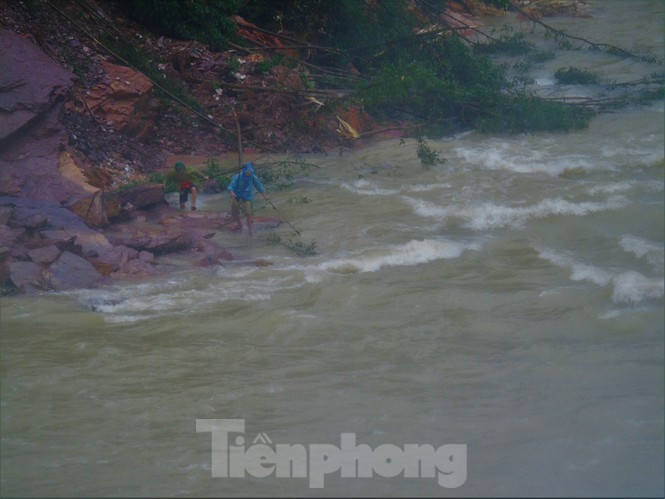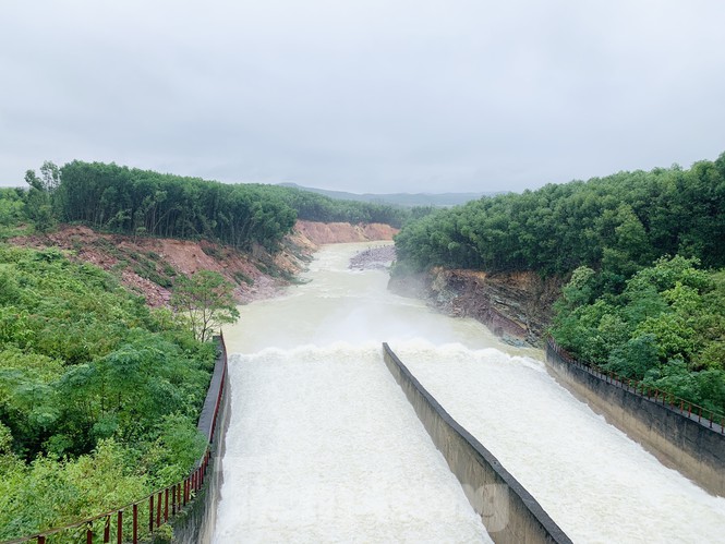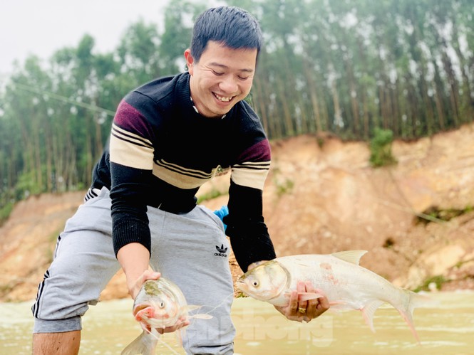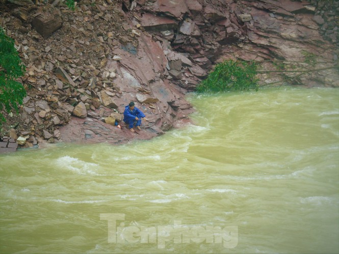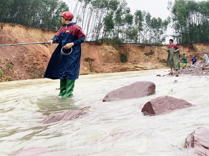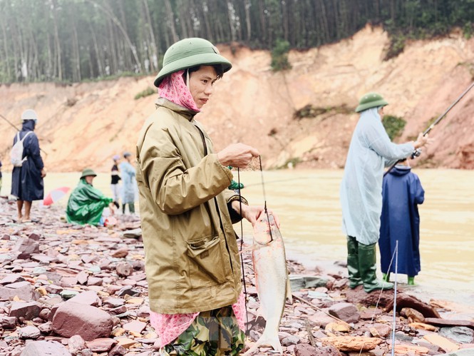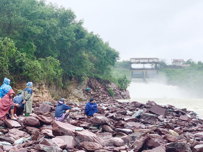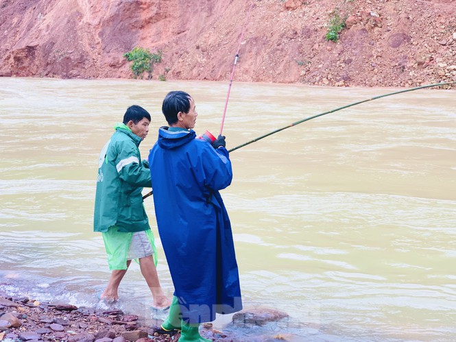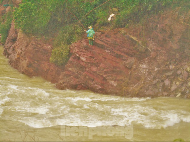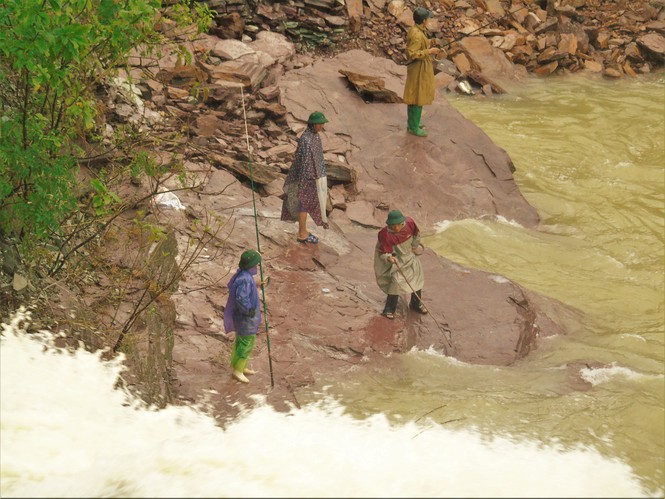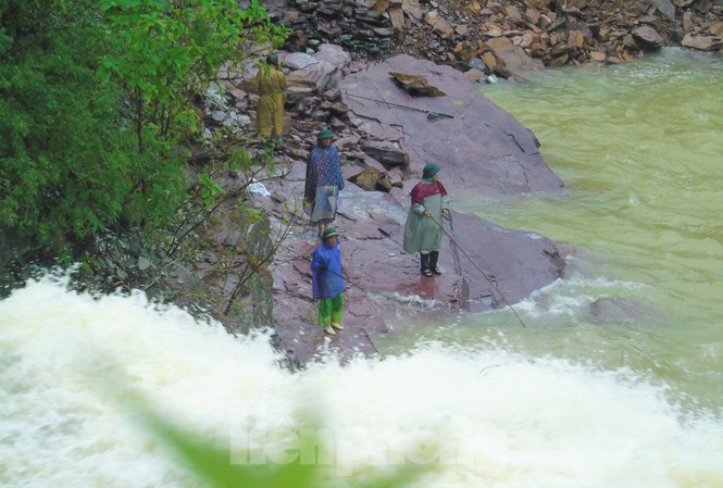 Mặc dù hồ Kẻ Gỗ đang xả tràn, nhưng hàng chục người dân vẫn bất chấp nguy hiểm đứng đánh bắt cá dưới dòng nước trắng xóa chảy xiết.