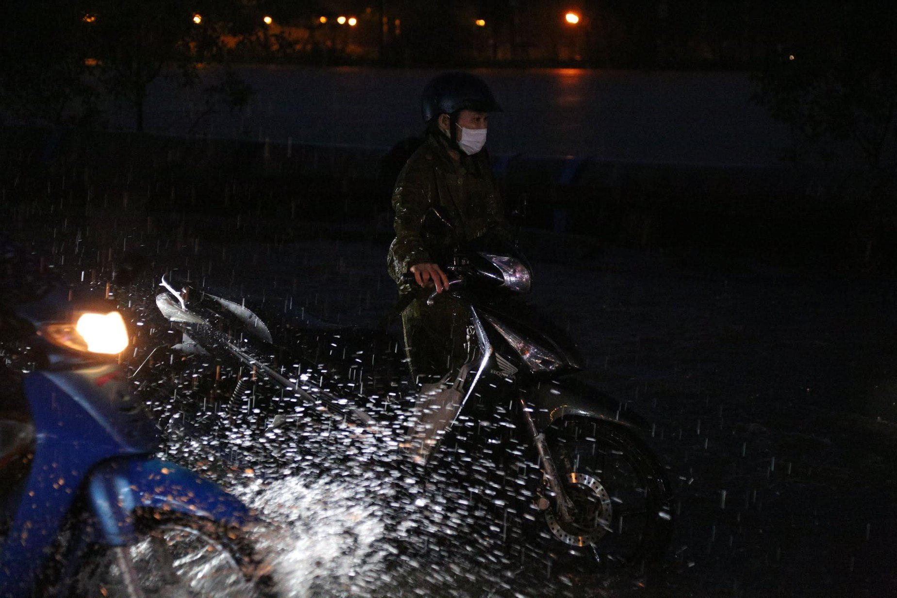 Hàng loạt xe máy bị chết máy giữa dòng nước đen ngòm, buộc người đi đường phải dắt bộ trong mệt mỏi.