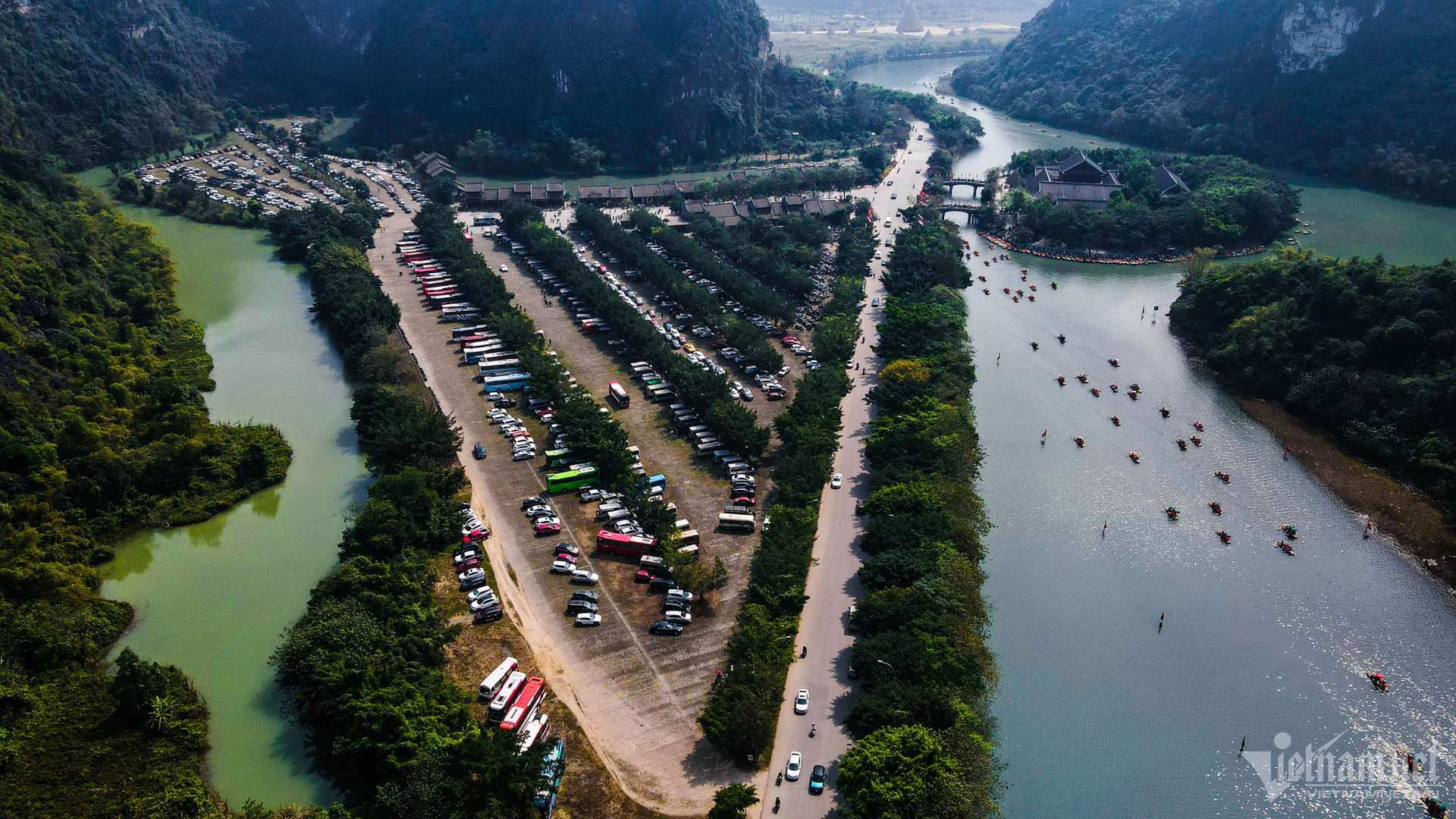 Mùng 3 Tết, khu du lịch sinh thái Tràng An (Ninh Bình) đón hàng nghìn du khách đến vãn cảnh đầu năm. 2.000 thuyền bè đã được huy động làm việc hết công suất.