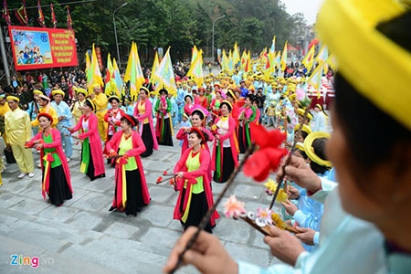Lễ hội bắt đầu vào 8h sáng, mở màn bằng màn rước kiệu cờ hoa và tế của các đoàn đến từ nhiều tỉnh, thành. |
