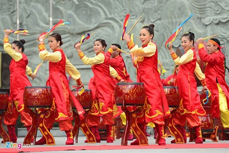 Tiết mục trống hội Thăng Long rộn rã gợi nhớ ngày chiến thắng hơn 200 năm trước. |