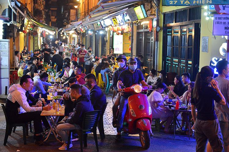 Ngay sau khi được mở cửa đến sau 21 giờ, các hàng quán, cơ sở kinh doanh ăn uống nhộn nhịp trở lại. Nhiều hàng quán tại các phố ăn đêm nổi tiếng như Tạ Hiện, Lương Ngọc Quyến, Tống Duy Tân... đông nghịt thực khách.