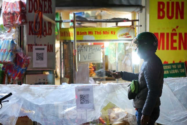 Tại phố Trần Quý Cáp, hàng ăn còn căng dây, che chắn túi ni lông ngăn cách giữa người mua và bán để đảm bảo phòng, chống dịch.