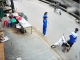 Đúng khoảnh khắc đó, một người đàn ông 50 tuổi đang điều khiển xe máy với tốc độ khá cao chạy tới. Do tình huống phát sinh quá đột ngột, bánh xe đã vướng phải quả bóng khiến người điều khiển hoàn toàn mất lái và ngã đập mạnh xuống mặt đường.