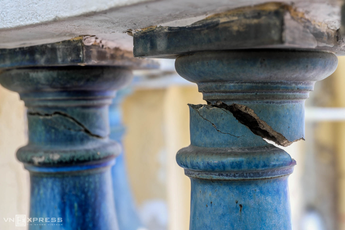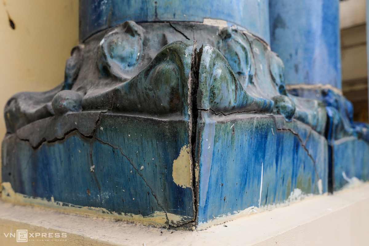 Những phù điêu đắp trên các cột chịu lực ở mặt sau bảo tàng bị nứt nẻ bốn góc, lộ kết cấu xi măng bên trong.