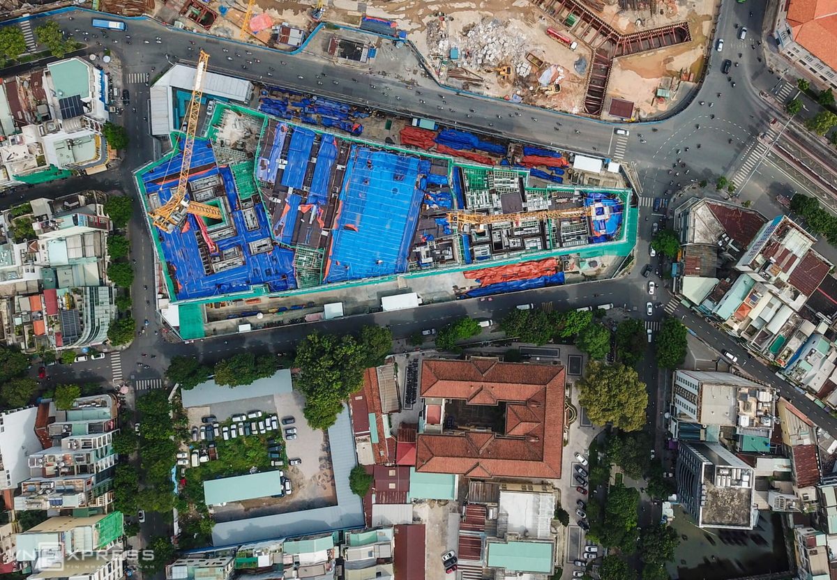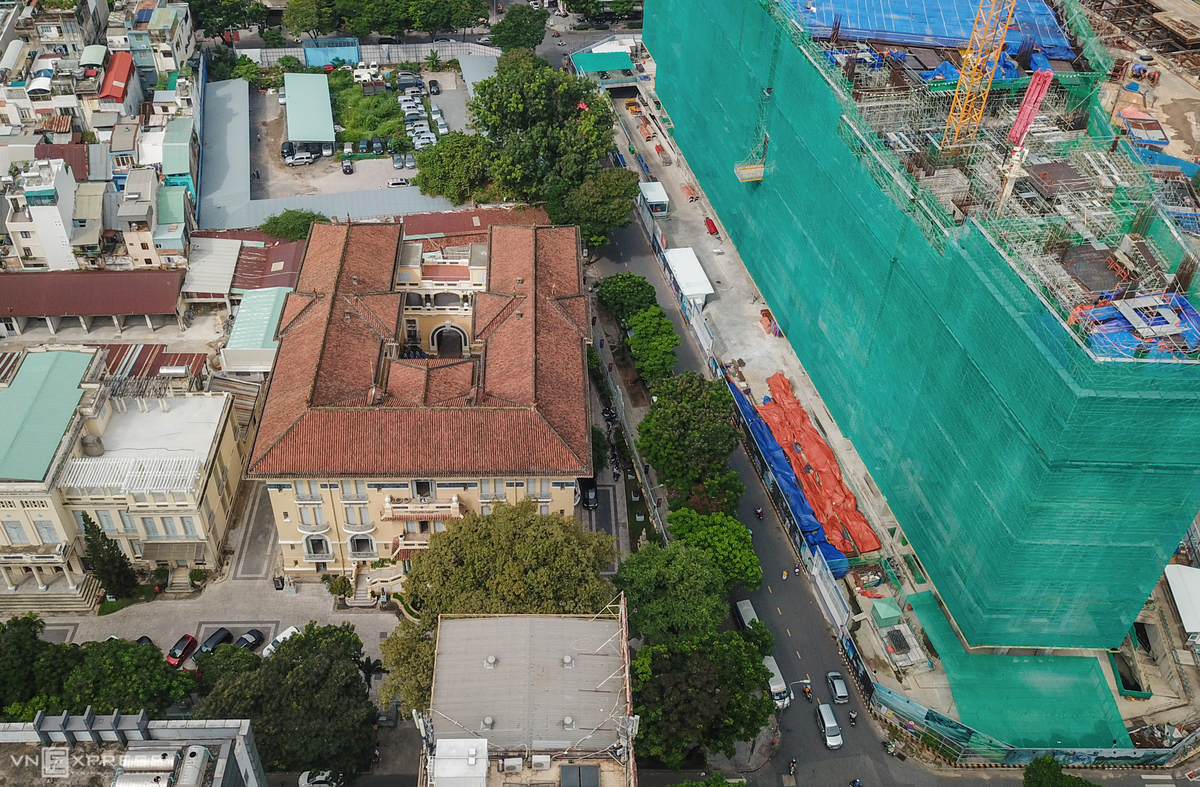 Bảo tàng Mỹ thuật TP HCM nhìn từ trên cao, cạnh đó là công trình cao ốc tứ giác Bến Thành.