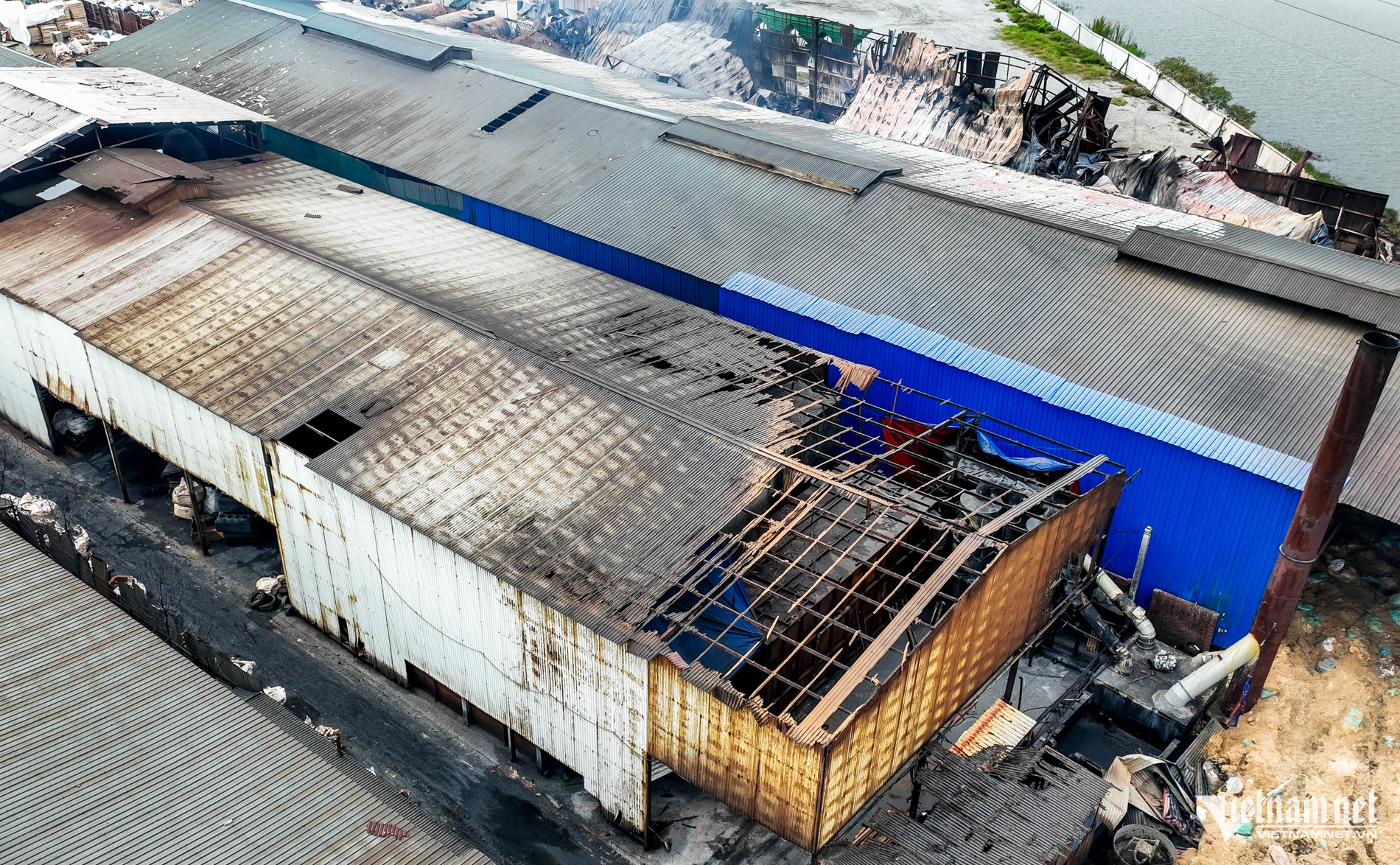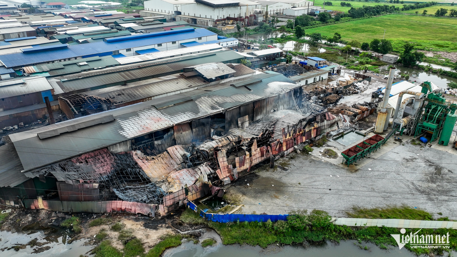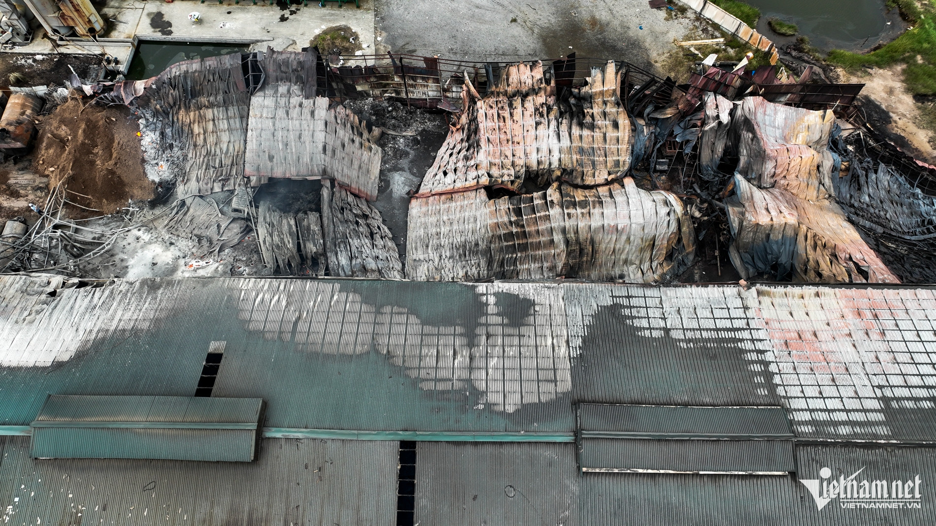 Khung nhà xưởng làm bằng sắt, mái lợp tôn bị ngọn lửa làm đổ sập, biến dạng. Phía trong nhà xưởng chỉ còn lại đống tro tàn. Mùi khét vẫn ám đặc trong không khí.