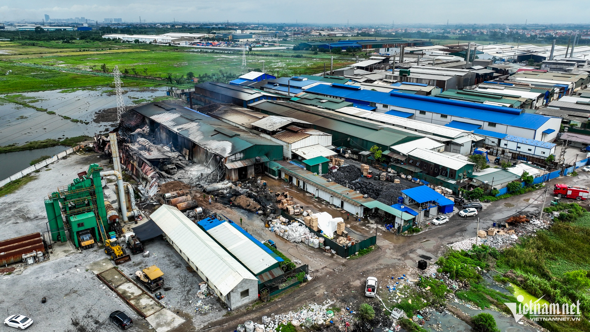 Theo ghi nhận của PV VietNamNet, tại hiện trường vụ cháy xảy ra tại xưởng tái chế phế liệu ở xã Minh Hải, khu vực xưởng rộng hàng trăm m2 bị ngọn lửa thiêu rụi, ám màu đen kịt.