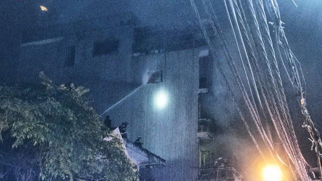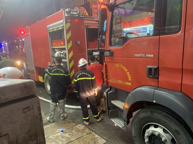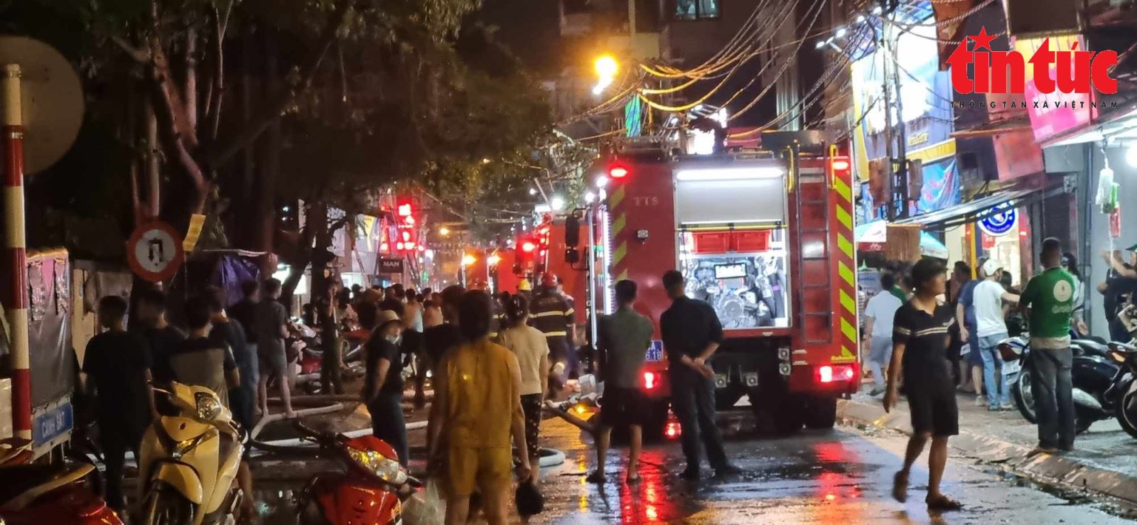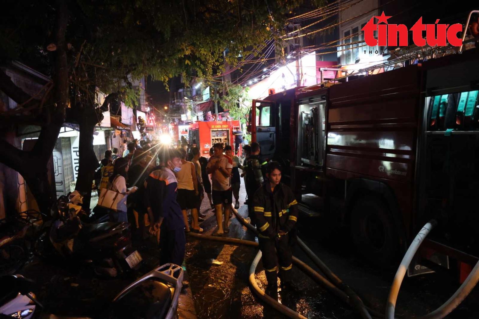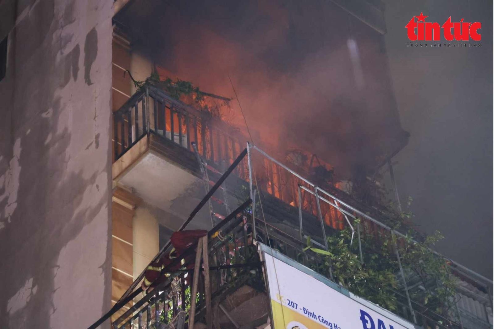 Công an Hà Nội điều động 4 xe chữa cháy đến hiện trường vụ cháy ở Định Công Hạ. Lực lượng PCCC kết hợp phun vòi rồng và leo lên mái nhà bên cạnh để tiếp cận bên trong.
