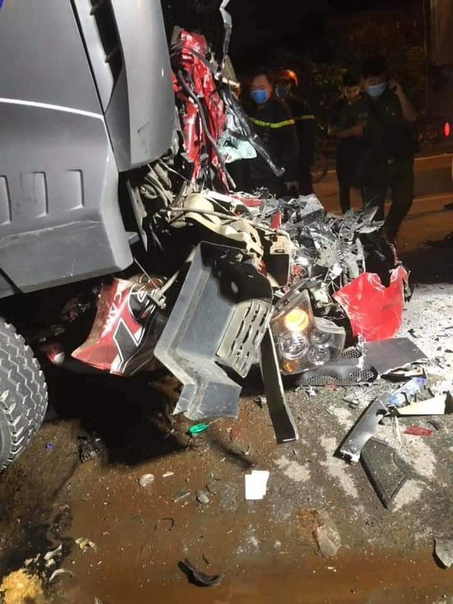 Sáng nay, chiếc xe con bị xe container chồm lên nóc từ phía sau khiến 3 người tử vong trong xe.