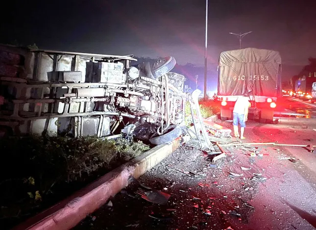 Hai xe tải đấu đầu rồi lật ngang trên đường Tạo Lực ở Bình Dương. Vụ tai nạn làm 4 người thương vong.
