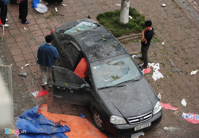 Một chiếc ôtô Daewoo đỗ cách hiện trường vụ nổ 20 mét bị vỡ kính trước và sau. Ảnh: Việt Hùng. |