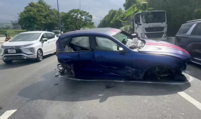Ôtô Maserati Levante Trofeo trị giá 15 tỷ đồng chạy trên đường Mai Chí Thọ, bất ngờ tông vào dải cách bêtông vỡ nát phần đuôi, đầu xe, nhiều mảnh vỡ văng xa hơn chục mét.