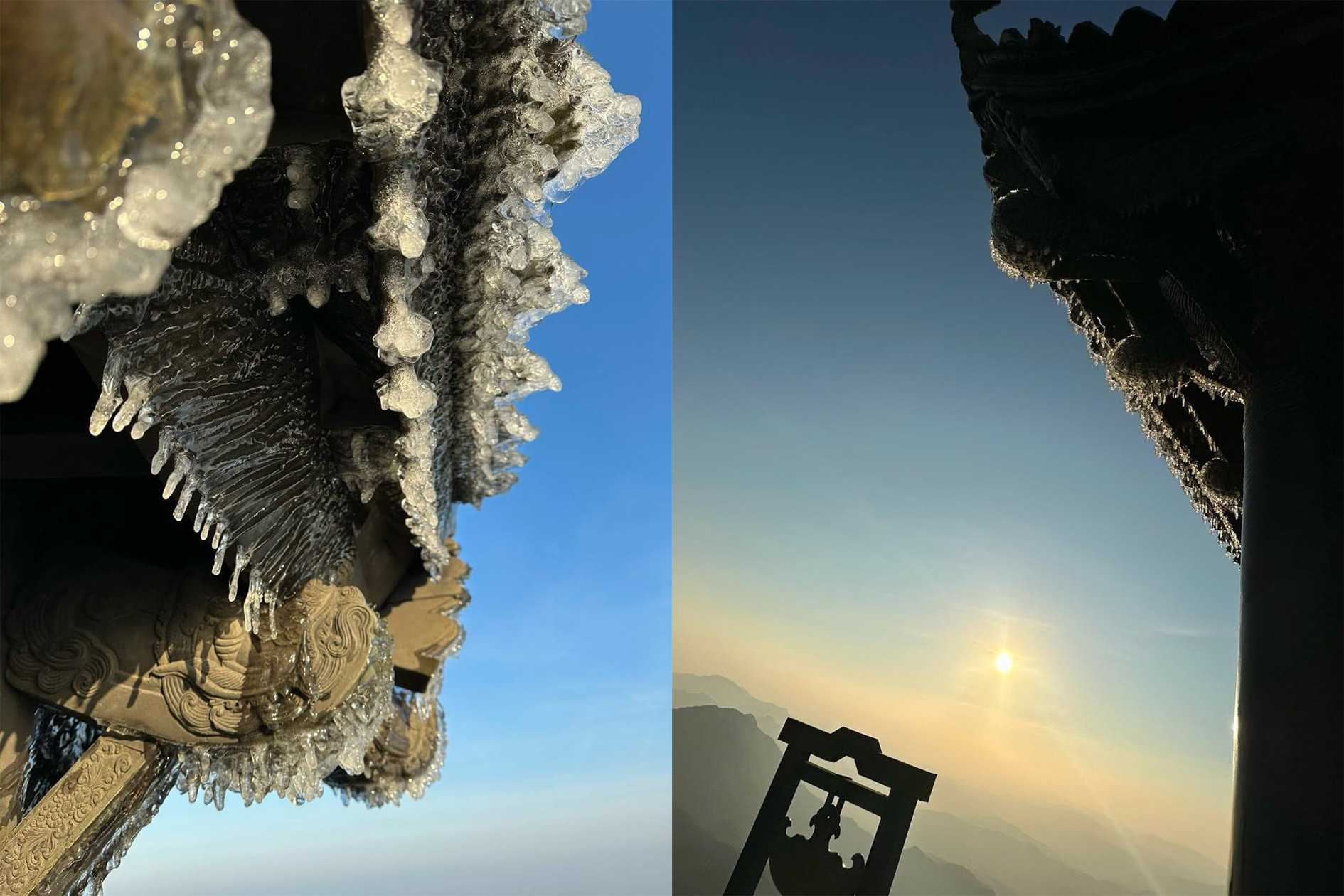 Tại đây, xung quanh phần mái của chùa Đồng băng giá đóng cứng, cây cối bên dưới cũng bị đóng một lớp băng. Do nhiệt độ xuống thấp nên mặc dù trời có nắng vào buổi trưa nhưng lớp băng giá này vẫn chưa tan.