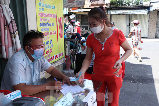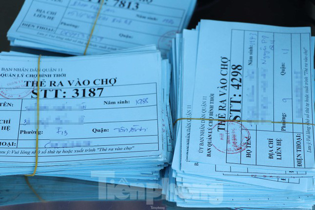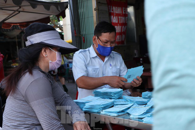 Để đảm bảo giữ khoảng cách, tránh tụ tập quá đông người trong chợ gây mất an toàn phòng chống dịch COVID-19, Ban quản lý chợ Bình Thới, quận 11, TPHCM phối hợp cùng chính quyền địa phương tiến hành phát phiếu cho người dân để kiểm soát số lượng người vào chợ.