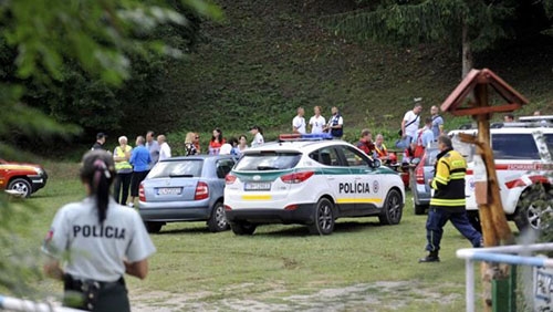 Nhân viên cảnh sát và nhân viên cứu hộ đã tập trung tại một cơ sở cứu hộ tạm thời tại sân vận động làng Cerveny Kamen, Slovakia. (Ảnh: Dalibor Gluck / CTK qua AP). |