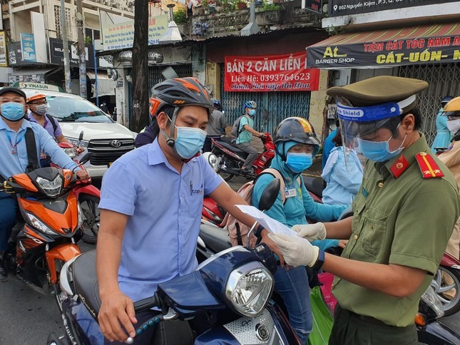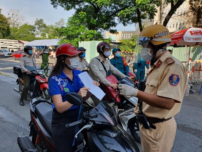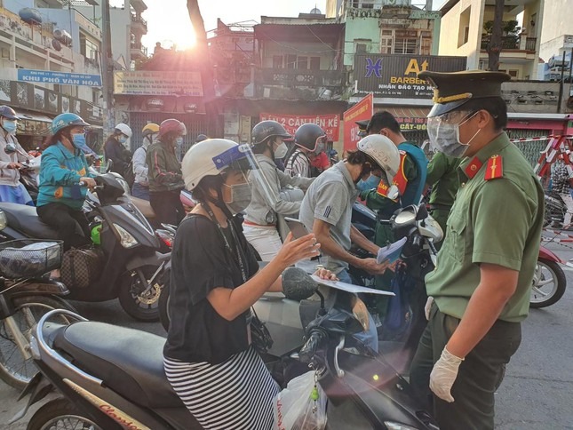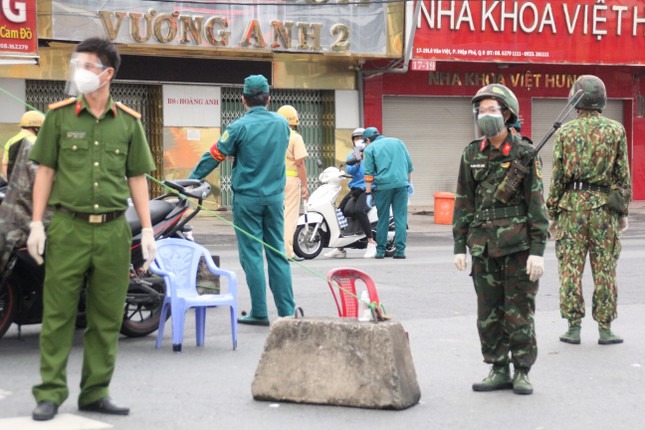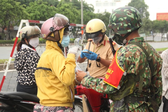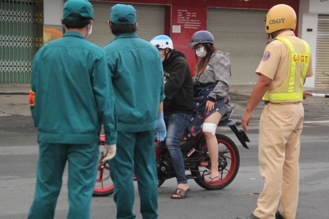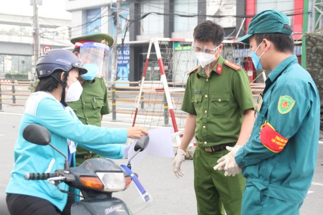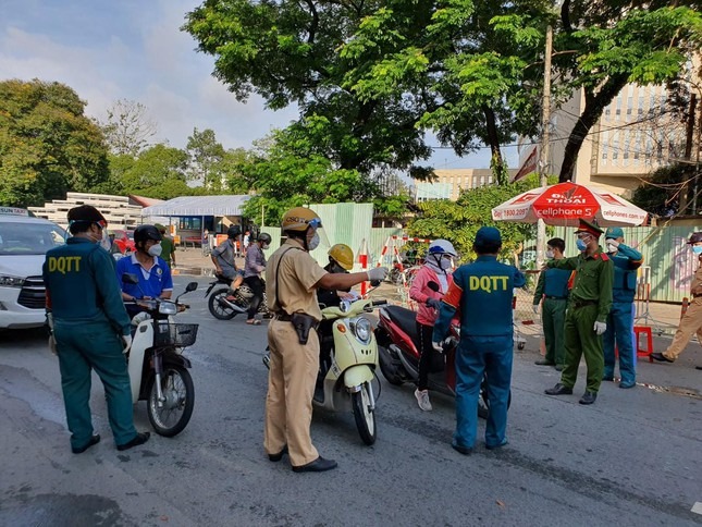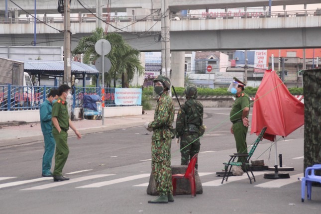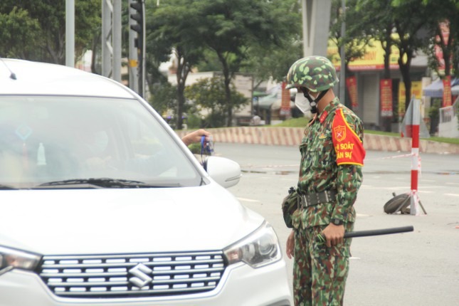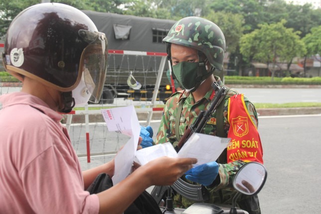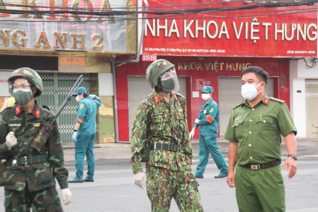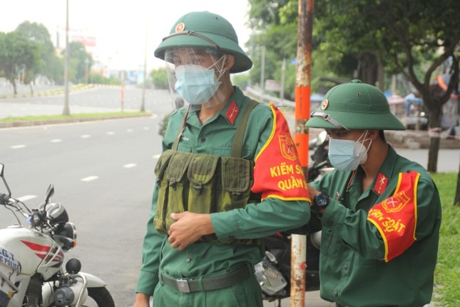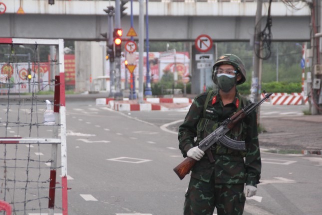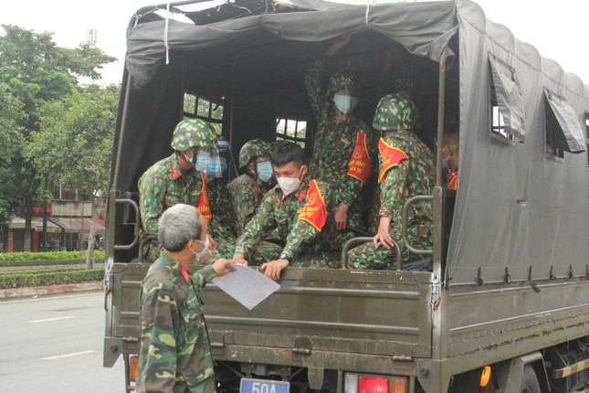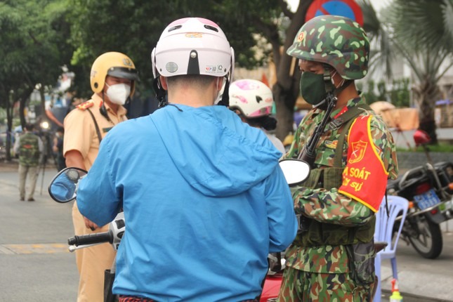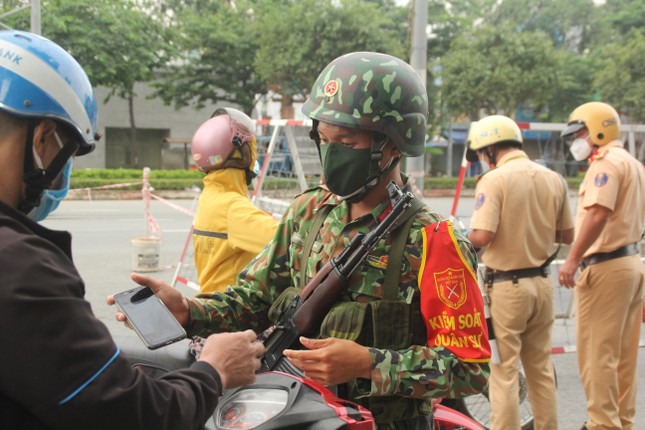 Trong buổi sáng đầu tiên thành phố thực hiện siết chặt giãn cách toàn thành phố, ngoài các lực lượng chức năng TPHCM, các đơn vị quân đội đã cùng hiệp đồng thực hiện nhiệm vụ kiểm soát người đi đường.