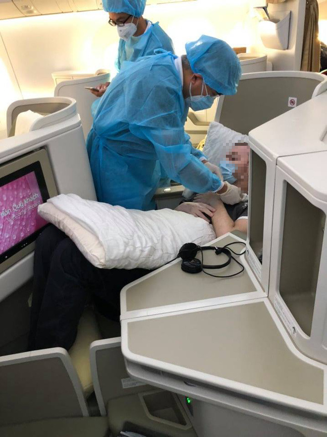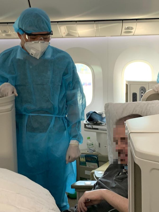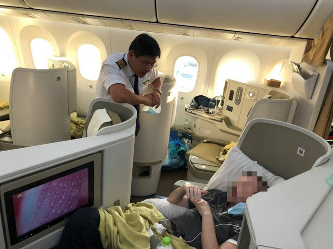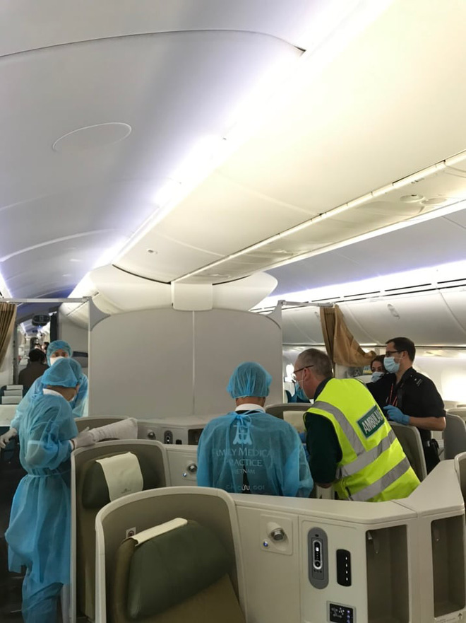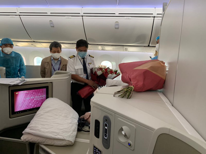 Trong hơn 14 giờ bay từ Hà Nội đi Anh, Vietnam Airlines cũng sắp xếp ghế đồng hạng cho 3 bác sĩ đi cùng và bố trí vị trí để 6 bình ô-xy để phục vụ cho phi công này.
