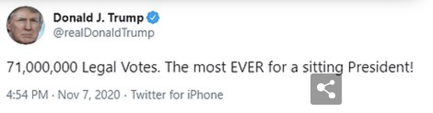 Theo đó, sau thất bại này, ông Trump là Tổng thống thứ 11 của nước Mỹ phải rời Nhà Trắng chỉ sau đúng 1 nhiệm kỳ. Donald Trump cũng viết trên Twitter sau khi về Nhà Trắng như sau: "Tôi là Tổng thống tại vị nhận được số phiếu bầu cao nhất trong lịch sử từ trước đến nay, 71 triệu phiếu."