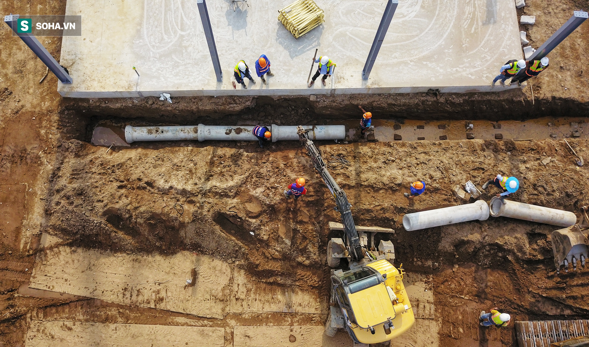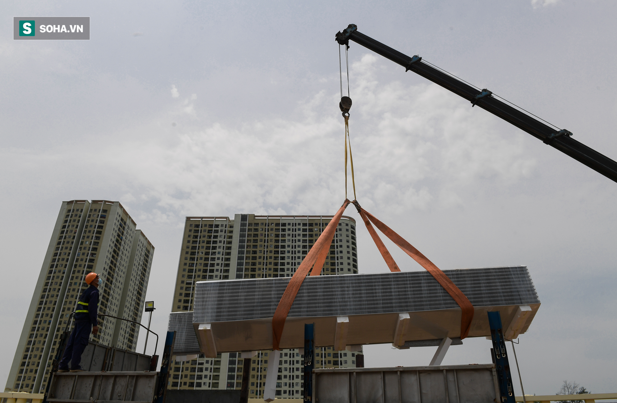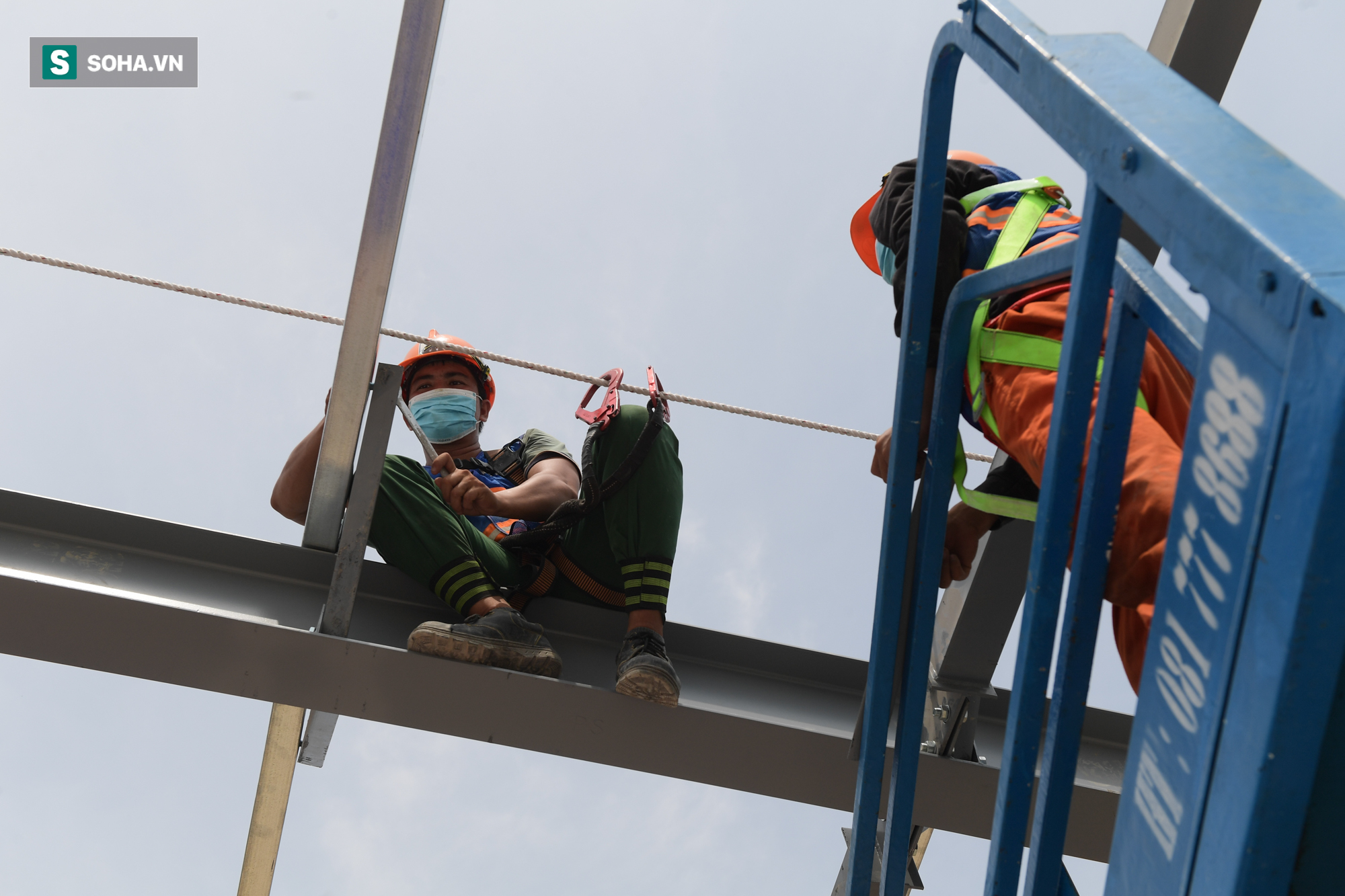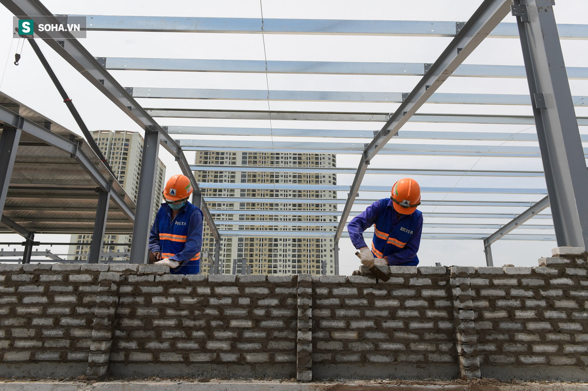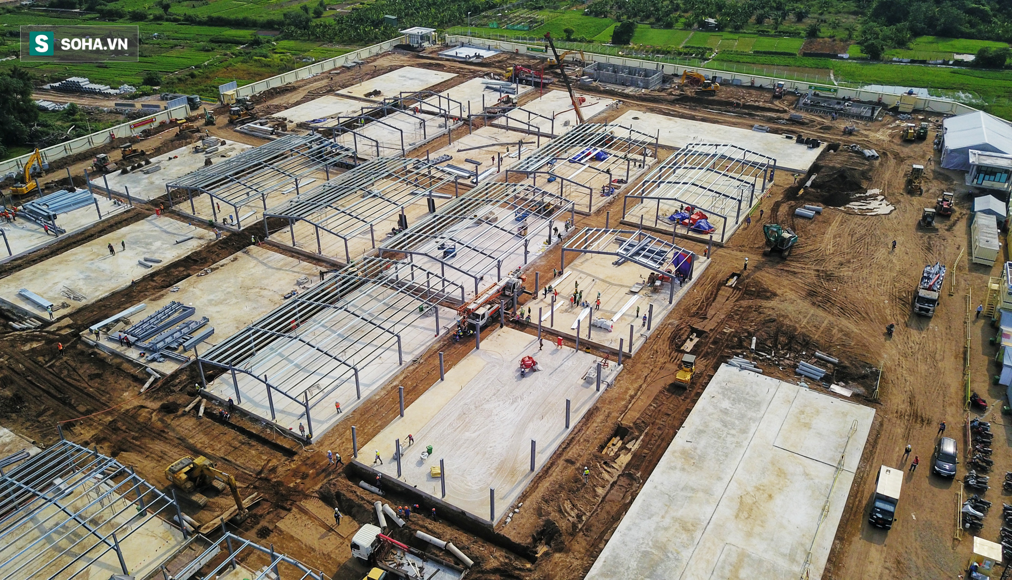 Hơn 400 công nhân cùng hàng chục máy móc thay nhau làm việc 24/24h trên công trường bệnh viện dã chiến tại quận Hoàng Mai, Hà Nội, sau 10 ngày thần tốc xây dựng, nhiều hạng mục đã hoàn thiện và bắt đầu đến công đoạn lợp mái.
