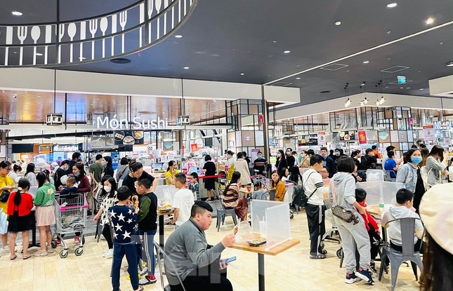 Tại một trung tâm thương mại lớn ở quận Hà Đông, người dân xếp hàng quét mã QR khai báo y tế trước khi vào vui chơi và mua sắm.
