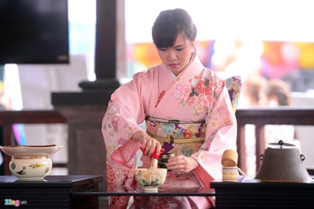 | Thiếu nữ Việt thể hiện kỹ thuật trà đạo Nhật Bản. |