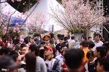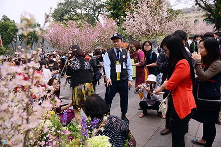 | Sáng 20/3, hàng nghìn người dân thủ đô Hà Nội đổ về khu vực tượng đài Lý Thái Tổ để chiêm ngưỡng hoa anh đào Nhật Bản. |