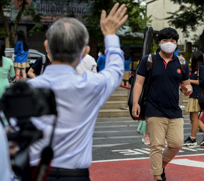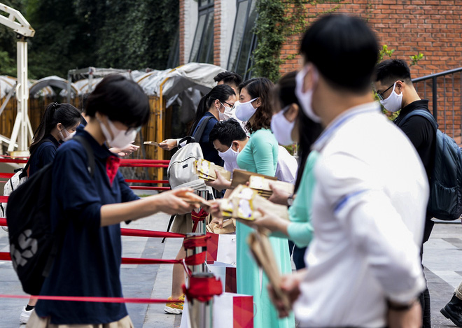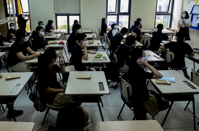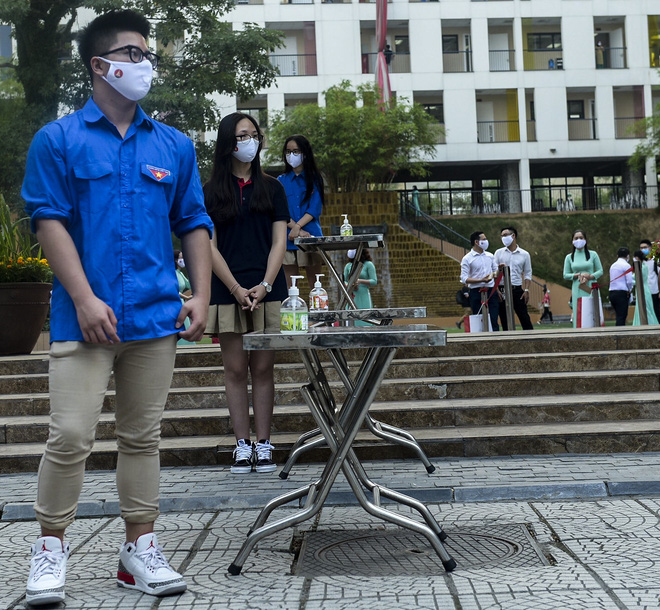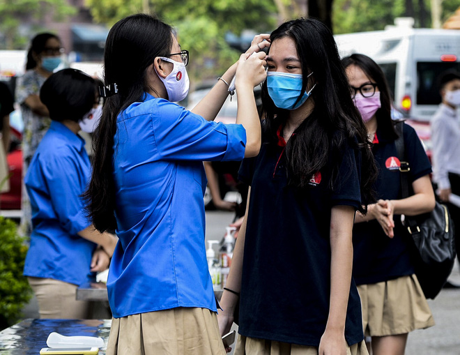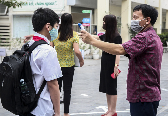 Trong ngày đầu đến trường sau kỳ nghỉ kéo dài để phòng, chống COVID-19, hầu hết tất cả các học sinh tại các trường học trên địa bàn TP Hà Nội đều được kiểm tra thân nhiệt và phát khẩu trang.