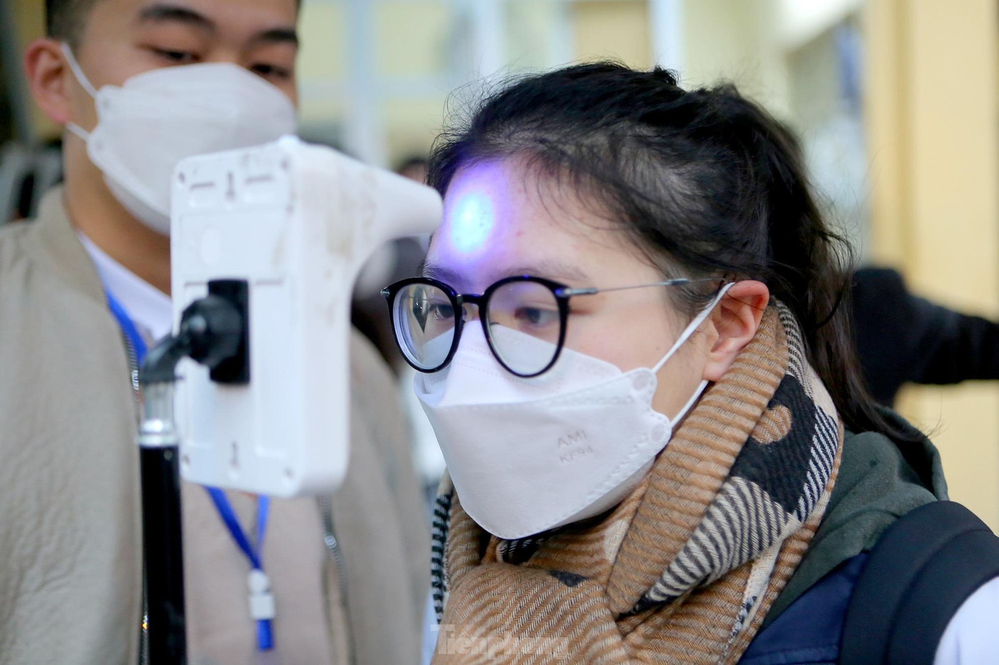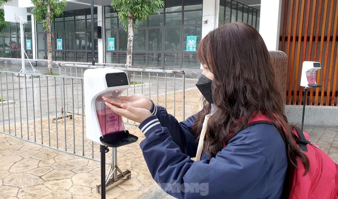 Các bạn học sinh đều được đo thân nhiệt, sát khuẩn tay đảm bảo công tác phòng, chống dịch ngay từ cổng trường.