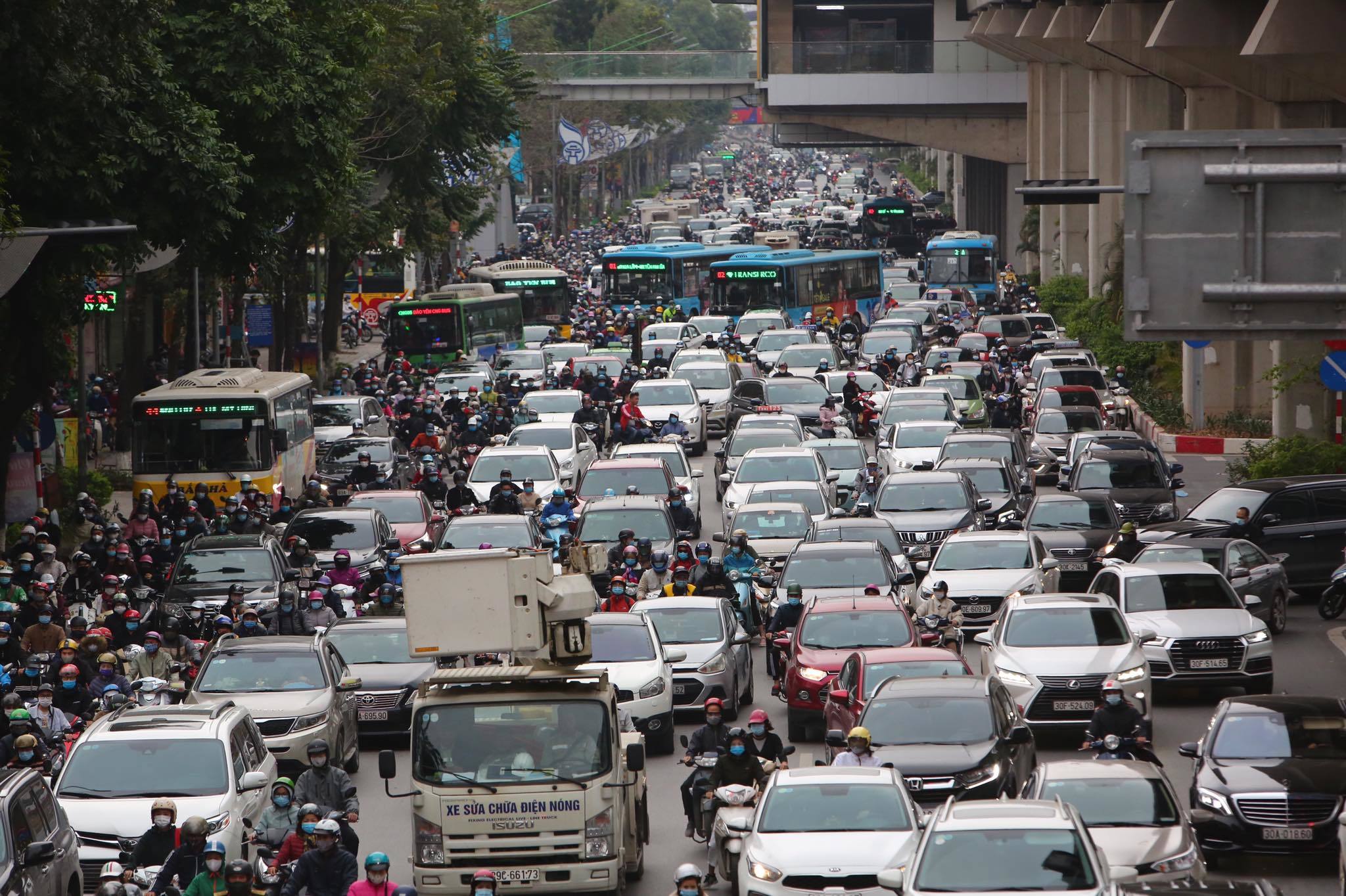 Sáng nay (2/3) là ngày đầu tiên học sinh Hà Nội đi học trở lại sau kỳ nghỉ Tết Tân Sửu kéo dài 1 tháng do dịch Covid-19. Người dân vất vả để di chuyển trên đường.