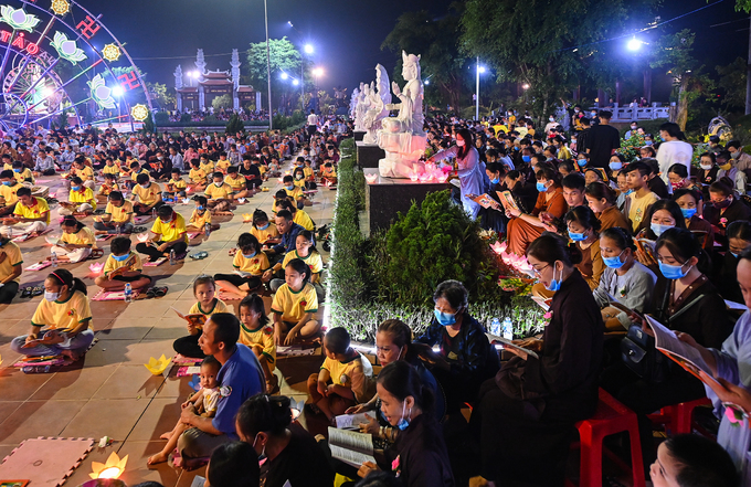 Khuôn viên chùa Ninh Tảo, Hà Nam, lung linh ánh nến, rực rỡ sắc màu hoa đăng trong buổi lễ Vu Lan báo hiếu tối 2/9.