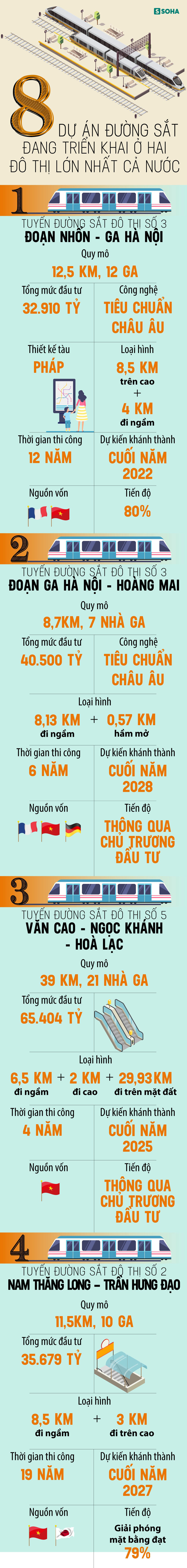 8 tuyến đường sắt đã và đang triển khai thi công này hứa hẹn sẽ góp phần tạo nên mạng lưới giao thông hiện đại, an toàn cho người dân 2 đô thị lớn nhất cả nước.