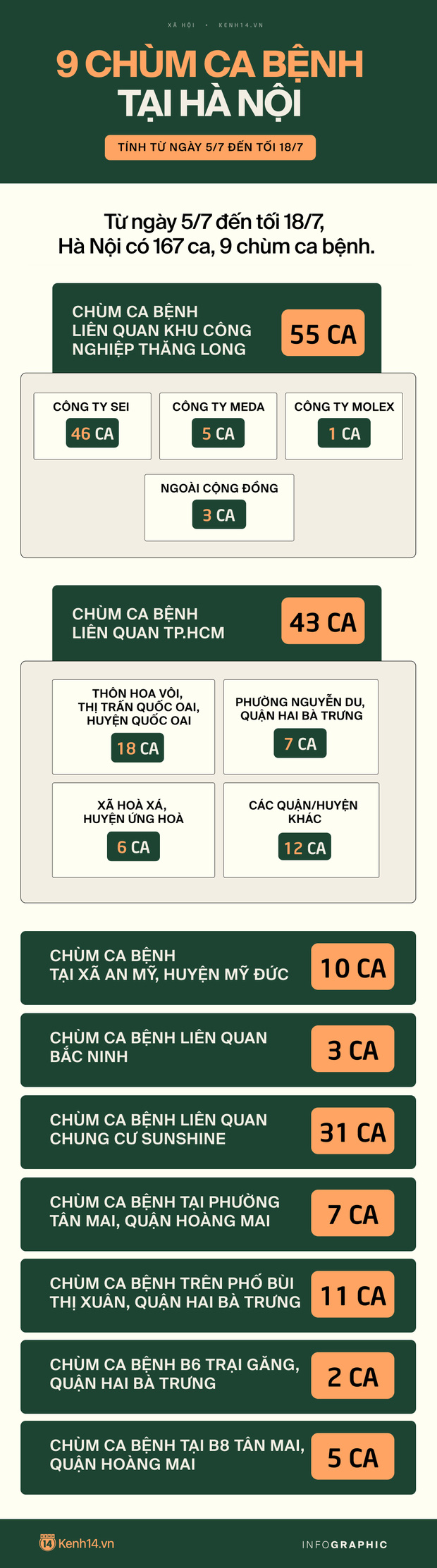 Đợt dịch thứ 4 tại Hà Nội tính từ ngày 29/4 đến tối 18/7 ghi nhận tổng 427 ca dương tính SARS-CoV-2. Riêng từ ngày 5/7, toàn thành phố có 167 ca, thuộc 9 chùm ca bệnh khác nhau, trong đó nhiều chuỗi chưa rõ nguồn lây.