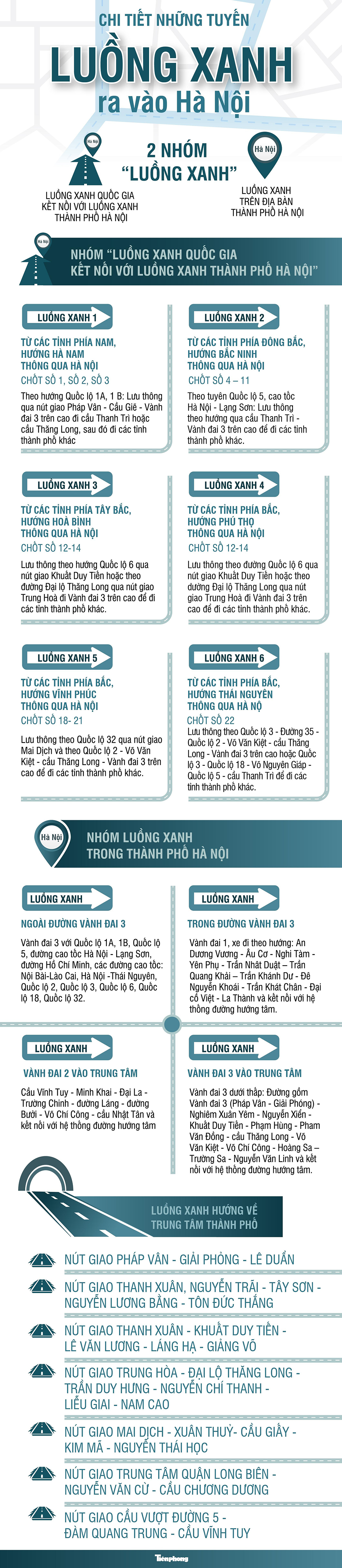 Ngày 24/7, Sở Giao thông vận tải Hà Nội công bố có 2 nhóm "luồng xanh", gồm “luồng xanh quốc gia kết nối với luồng xanh thành phố Hà Nội” và “luồng xanh trên địa bàn thành phố Hà Nội”. Dưới đây là chi tiết những tuyến "luồng xanh" ra, vào Thủ đô.