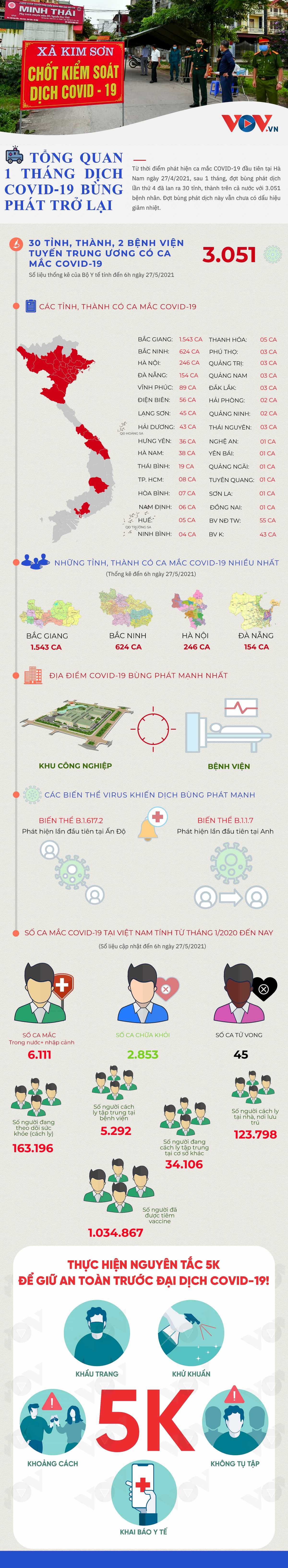 Từ thời điểm phát hiện ca mắc COVID-19 đầu tiên tại Hà Nam ngày 27/4/2021, sau 1 tháng, đợt bùng phát dịch lần thứ 4 đã lan ra 30 tỉnh, thành trên cả nước với 3.051 bệnh nhân.