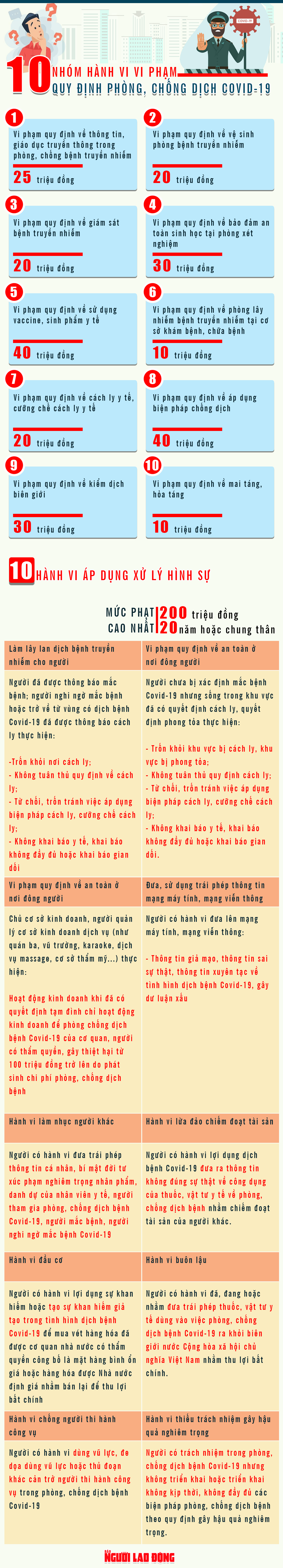 Trong 53 hành vi vi phạm quy định phòng, chống dịch Covid-19, có 43 hành vi xử lý hành chính với mức phạt tiền cao nhất là 200 triệu đồng và 10 hành vi xử lý hình sự với mức phạt tù đến 20 năm hoặc chung thân. Đây là những quy định vừa được Hà Nội công bố.