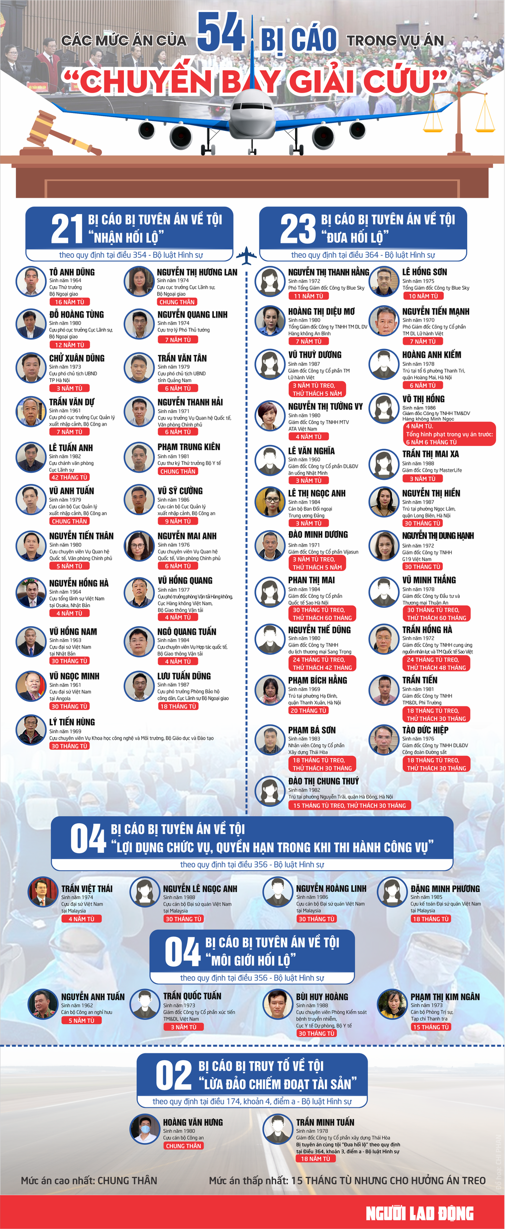 Trong số 54 bị cáo trong vụ án "chuyến bay giải cứu", TAND TP Hà Nội đã tuyên cao nhất là 4 án chung thân và thấp nhất là 15 tháng tù cho hưởng án treo; trong khi VKSND đề nghị 1 án tử hình, không có án chung thân