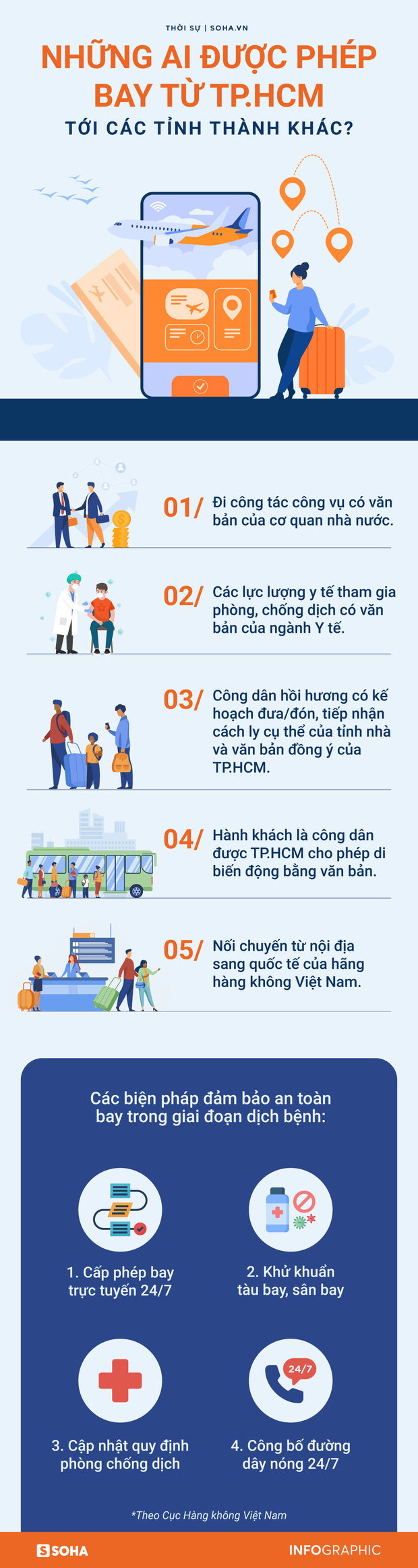 Cục Hàng không Việt Nam vừa ra thông báo về kế hoạch hoạt động vận chuyển hành khách với 5 trường hợp được phép bay từ TP HCM và một số tỉnh phía Nam.