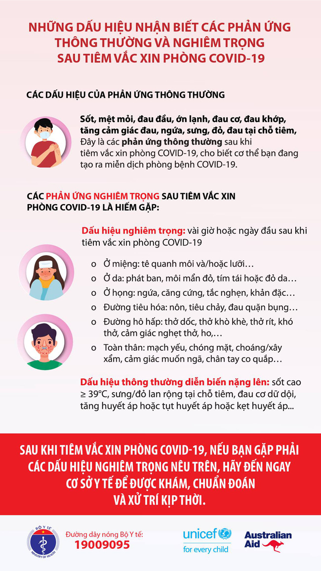 Việc nhận biết phản ứng thông thường và nghiêm trọng sau tiêm phòng vắc-xin Covid-19 được Bộ Y tế và Tổ chức Y tế Thế giới WHO đưa ra trong infographic dưới đây.