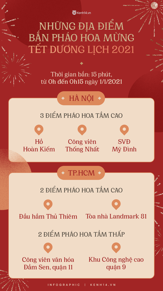 Hà Nội và TP.HCM đã có thông tin chính thức về các địa điểm bắn pháo hoa chào mừng Tết Dương lịch năm 2021. Thời gian bắn sẽ kéo dài 15 phút, từ 0h đến 0h15 ngày 1/1/2021.