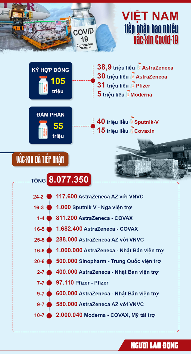 Tính đến ngày 12-7, Việt Nam đã nhận được khoảng 8 triệu liều vắc-xin, sắp tới sẽ tiếp tục nhận thêm từ các nguồn đã đàm phán mà các nước và hãng sản xuất đồng ý chuyển giao sớm cho nước ta, cũng như từ nguồn hỗ trợ của những đối tác song phương và tổ chức quốc tế.