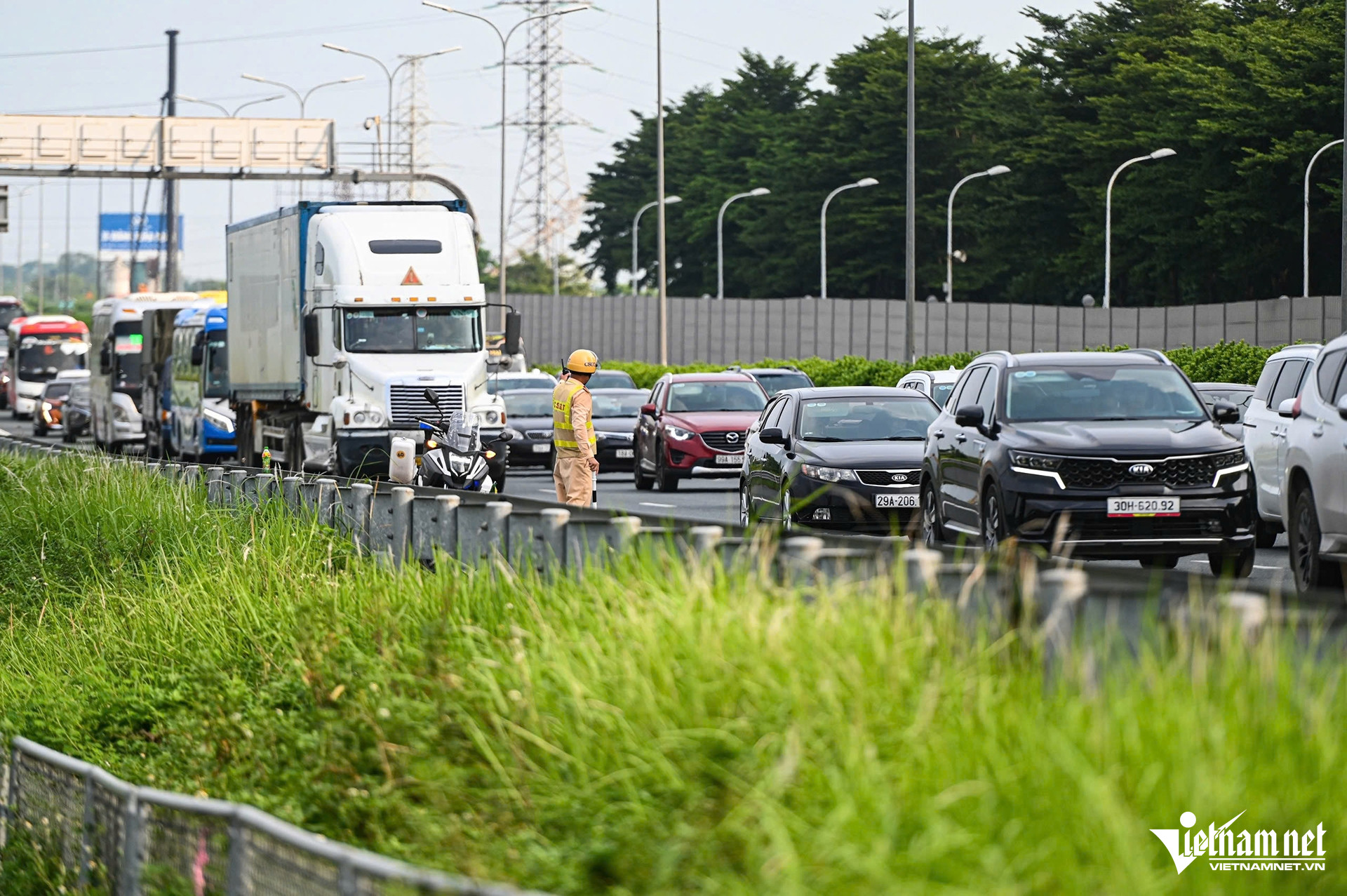 Đội Tuần tra kiểm soát giao thông đường bộ cao tốc số 3 (Cục CSGT) phối hợp cùng các lực lượng khác tăng cường phân luồng, hướng dẫn các phương tiện để không xảy ra ùn tắc giữa các luồng đi thẳng và lên nút giao đường vành đai 3.