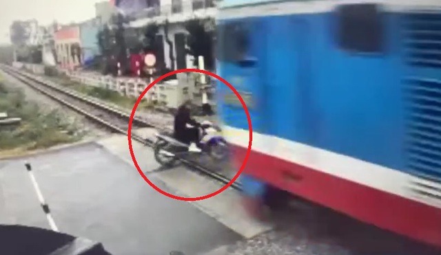 Hình ảnh ghi lại được cho thấy, thời điểm xảy ra sự việc, barie chắn tàu đã hạ xuống nhưng nhiều người vẫn cố tình vượt qua đường ray tàu. Vài giây sau, một nam thanh niên điều khiển xe máy đang di chuyển tới giữa đường ray thì bị đoàn tàu đi tới tông trúng.