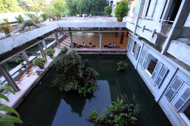 Phía sau dãy nhà cổ là những hồ nước được thả cả, sắp đặt hòn non bộ. Hàng ngày sinh viên thường tìm đến đây để ôn luyện, học nhóm vì không khí trong lành, mát mẻ. |