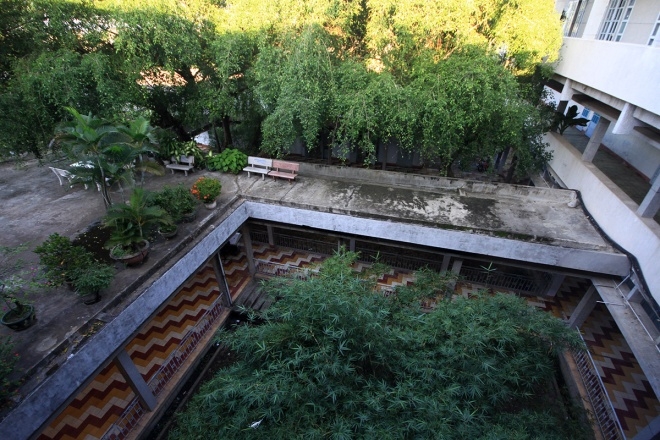 Ở khu nhà cổ này, dọc các lối đi tầng 1 đều được làm mái che, đổ kiên cố bằng bê tông cốt thép. Phía trên những mái che này còn được trồng cây xanh và kê bàn ghế để đi dạo. |