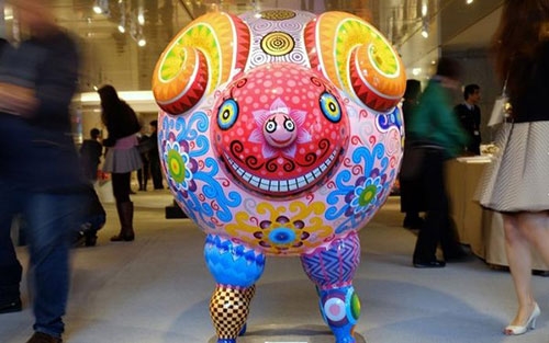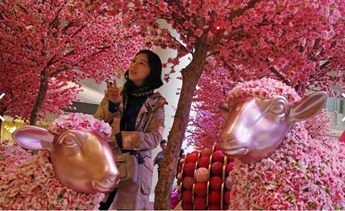 Du khách ở Đài Bắc đang đi qua một bức tượng trang hoàng mừng năm Ất Mùi |